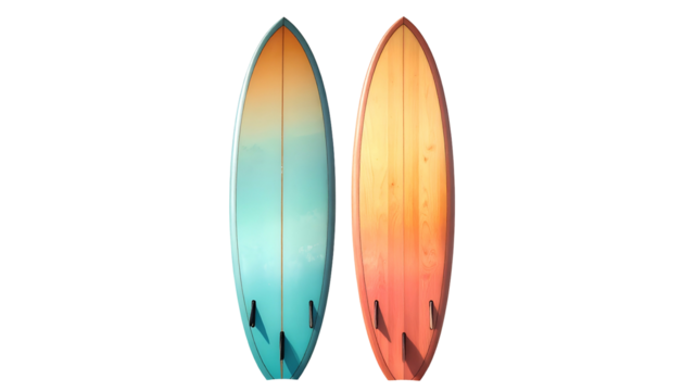 Two colorful surfboards stand vertically, a teal-orange gradient. Black background, fins visible