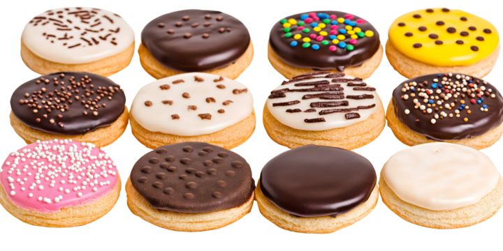White cream iced mini donuts with colorful sprinkles on transparent background