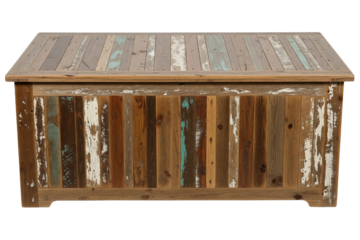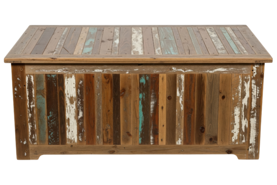 Vintage distressed wooden storage trunk chest with colorful paint on a transparent background