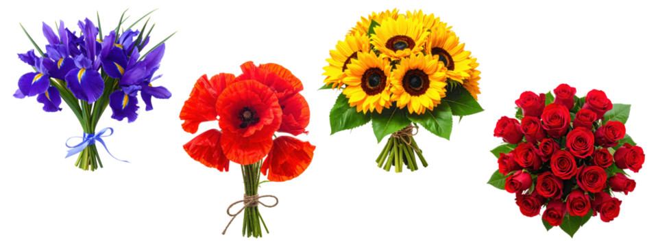 Set of colorful flower bouquets including red roses, sunflowers, poppies, and irises