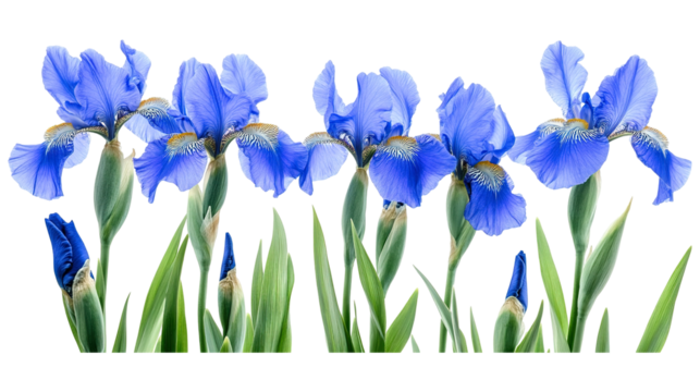 Beautiful blue iris flowers isolated on a transparent white background, clipping path