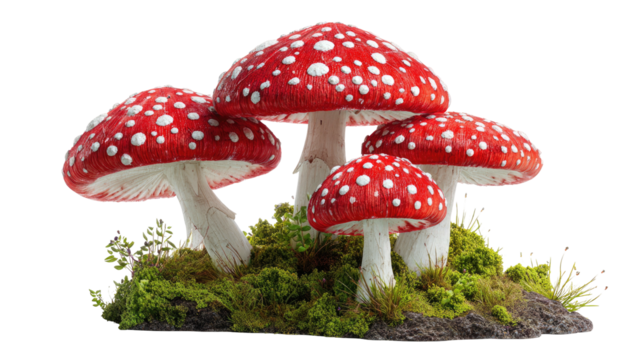 A classic mushroom on a transparent background with large white spots, a mushroom that grows in the forest, forest ecosystem, red mushroom.