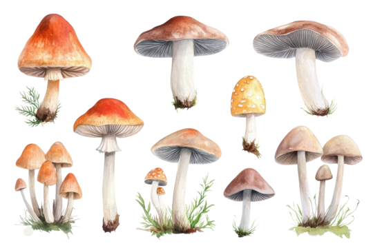 Colorful collection of soft watercolor mushrooms showcasing unique shapes and vibrant hues against a clean background