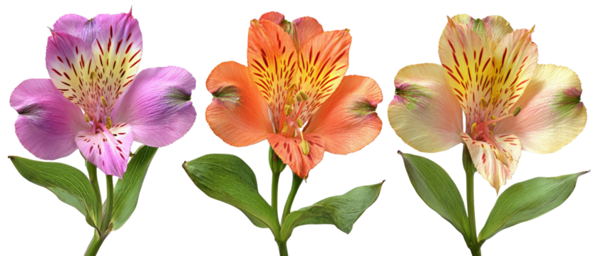 A vibrant display of three blooming alstroemeria flowers in shades of purple, orange, and yellow, set against a clean background, showcasing their intricate patterns and natural beauty