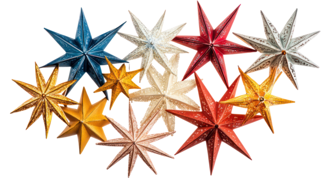 Colorful star ornaments on transparent background