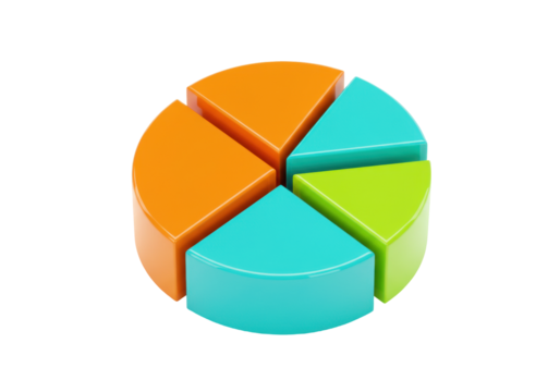 Vibrant 3D pie chart with four colorful sections isolated on transparent background.