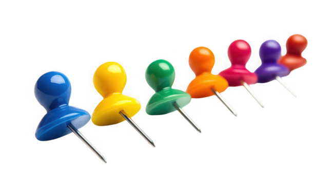 Colorful office push pins on transparent background