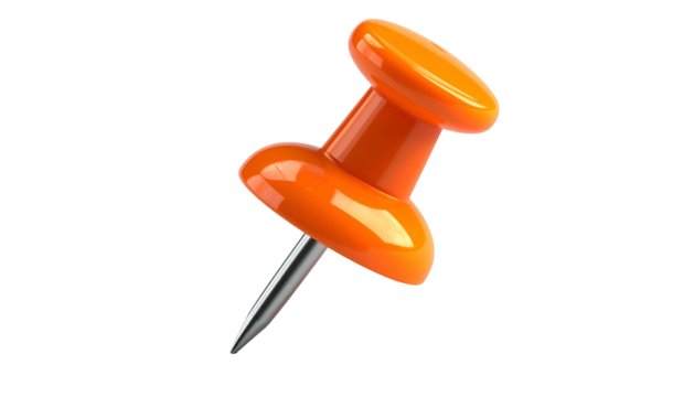 A close-up, glossy orange pushpin with a sharp metal pin on a black background