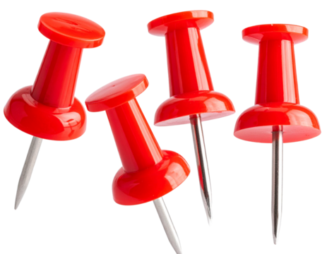 A collection of colorful pushpins in red, yellow, blue, and green, scattered on a background. Essential office supplies for bulletin boards and pinning documents. background removed