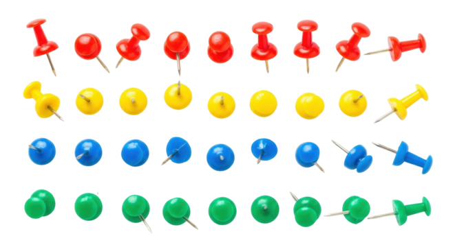 Colorful pushpins on transparent background, office and school supplies