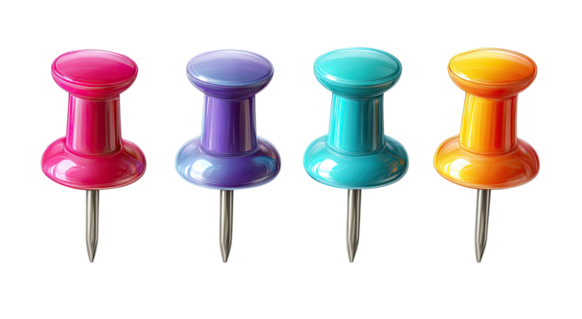 Colorful pushpins scattered on a transparent background, symbolizing organization, attachment, and office work