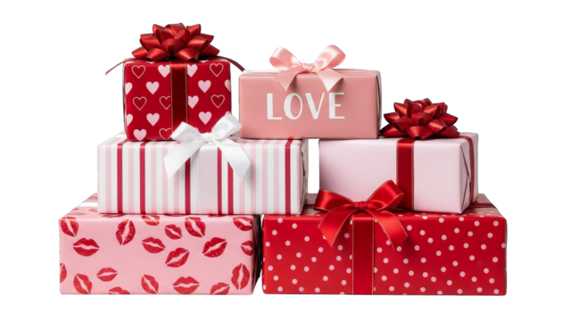 A stack of Valentine's Day gifts wrapped in festive paper with bows and romantic patterns.