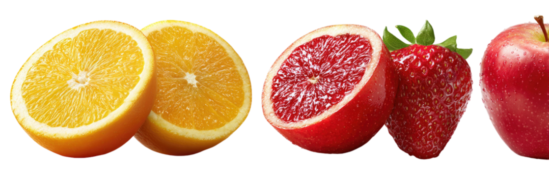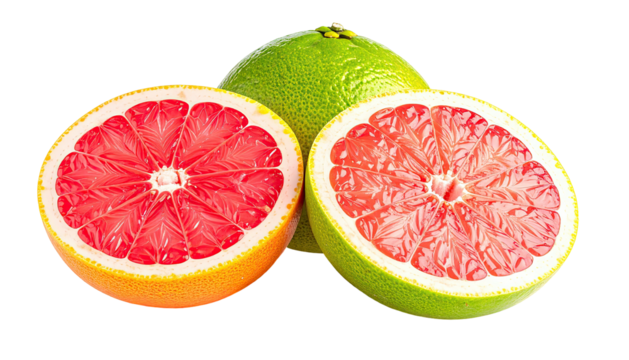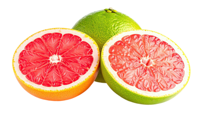 A vibrant still-life showcases a halved citrus fruit revealing juicy, crimson segments