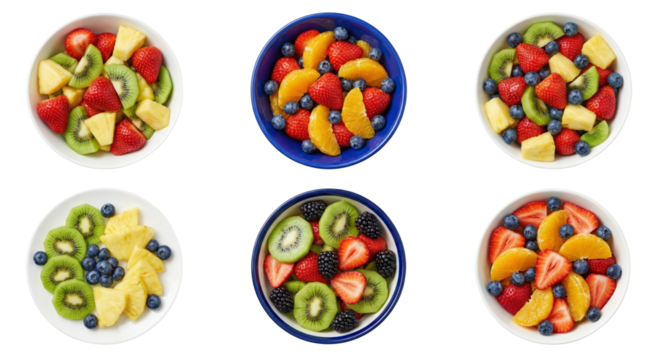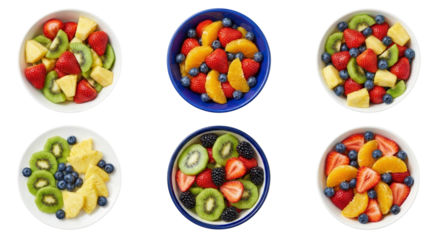 vivid assortment of colorful fresh fruit salads in bowls isolated on black background with