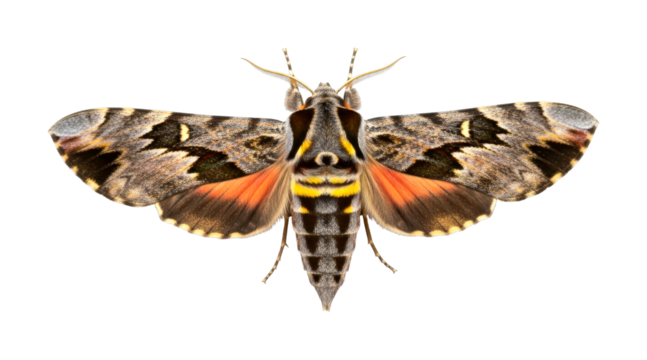 Beautiful colorful moth with intricate patterns, showcasing its striking yellow, orange, and brown wings, captured in exquisite detail, highlighting its delicate antennae and segmented body.