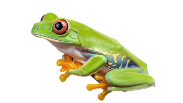 Isolated Red-Eyed Tree Frog perches with bright colors in studio shot with no shadows