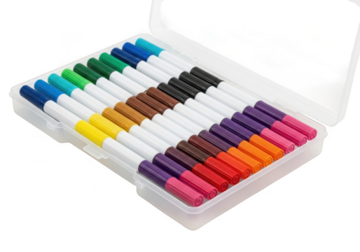 A set of colorful markers neatly arranged in a clear plastic case, isolated on transparent background