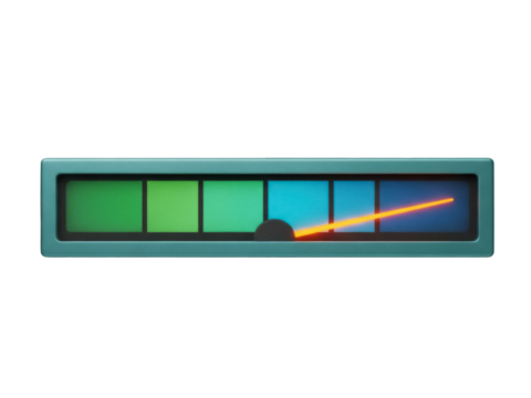 Isolated gauge needle display shows progress, teal frame, colorful scale, level indicator