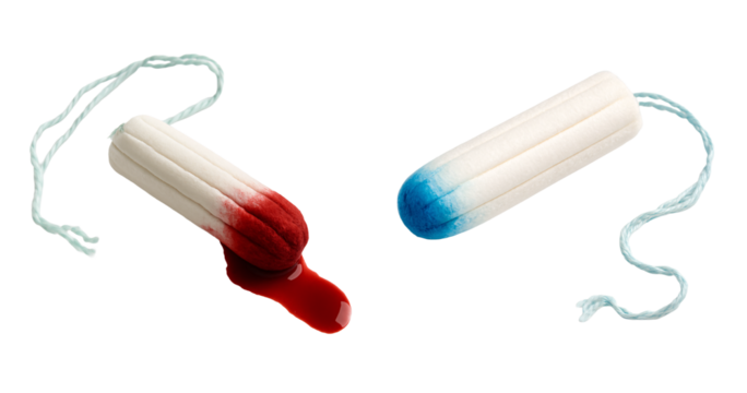 Tampons with blood stains on a white background. Feminine hygiene products. Educational medical illustration.