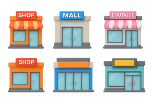 Colorful 3d buildings: shop, mall, and boutique icons for retail design