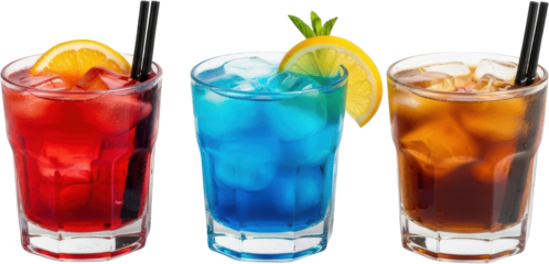 Three colorful refreshing cocktails with straws isolated on transparent background