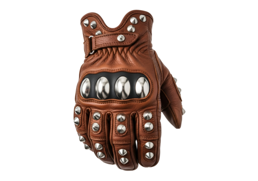 A brown leather motorcycle glove, adorned with metal studs and decorative metal plates, is showcased against a stark black backdrop.