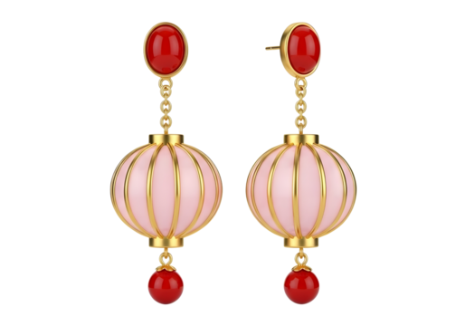 Elegant pink lantern shaped earrings with gold accents and red beads on white isolated on transparent background
