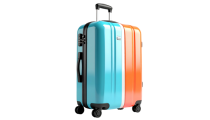 Hard-shell suitcase with a color block design, pulled-out handle, and rolling wheels