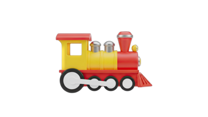 Classic cartoon style toy steam locomotive with red and yellow colors and white wheels on a transparent background isolated 3D render