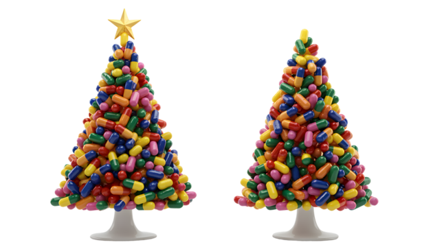Christmas tree made of medical capsules with a star on top, isolated on white or transparent background