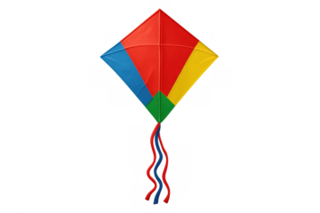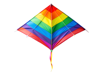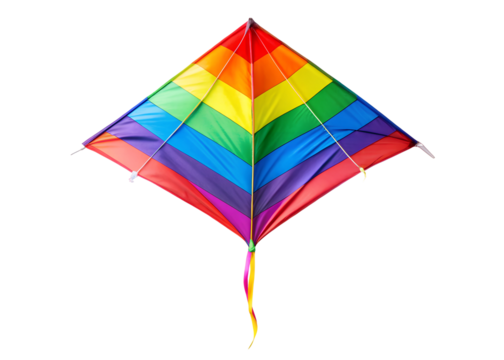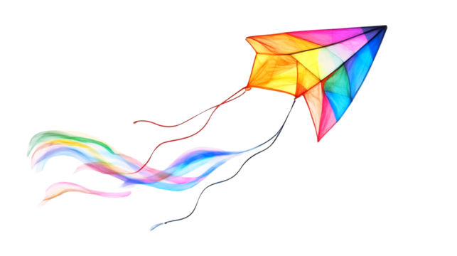 A colorful kite with a long tail and tied strings isolated on a transparent background