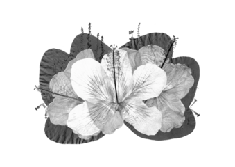 PNG. Fotografía de ramo decorativo de hibiscos, hojas y flores secas en blanco y negro. Herbario.