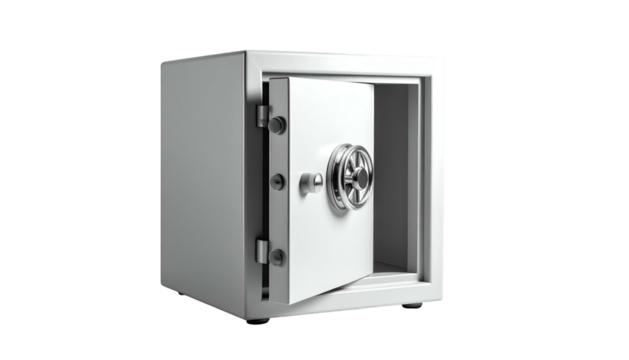 Heavy steel vault door with combination lock for securing valuables, offering bank level protection, isolated on transparent background