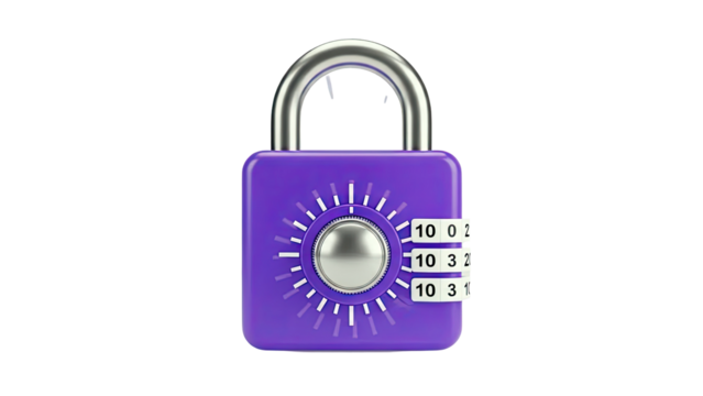 3D Purple combination padlock with silver shackle and dial on transparent background