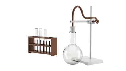 Scientific laboratory distillation apparatus with glass flasks and condenser isolated on transparent background