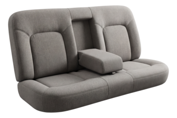 Three-seat rear bench with soft fabric upholstery and a fold-down armrest.