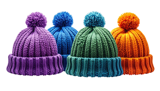 Row of colorful knitted beanies with pom-poms on a black backdrop