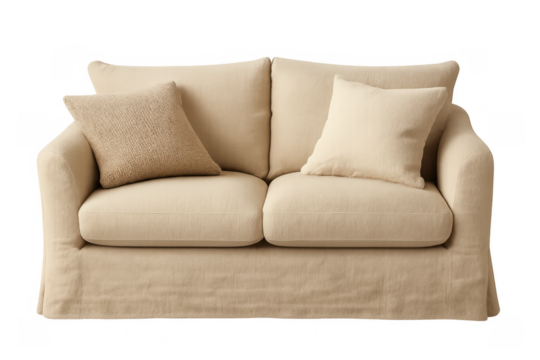 Neutral beige loveseat sofa with two decorative cushions, offering comfortable seating and home interior styling
