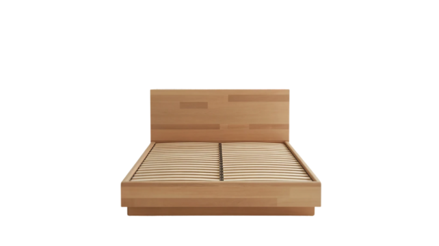Modern wooden bed with a padded headboard and a thick, quilted mattress on transparent background.