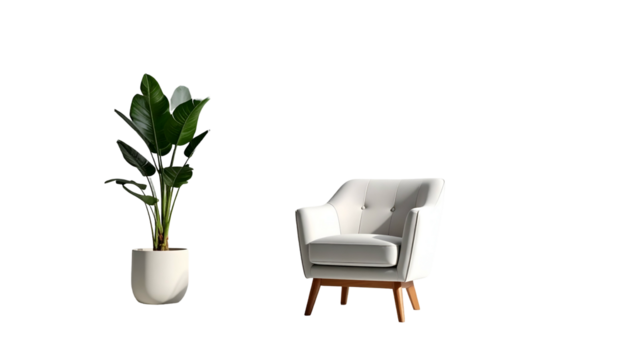Modern minimalist interior scene of a potted plant and a white armchair on black backdrop