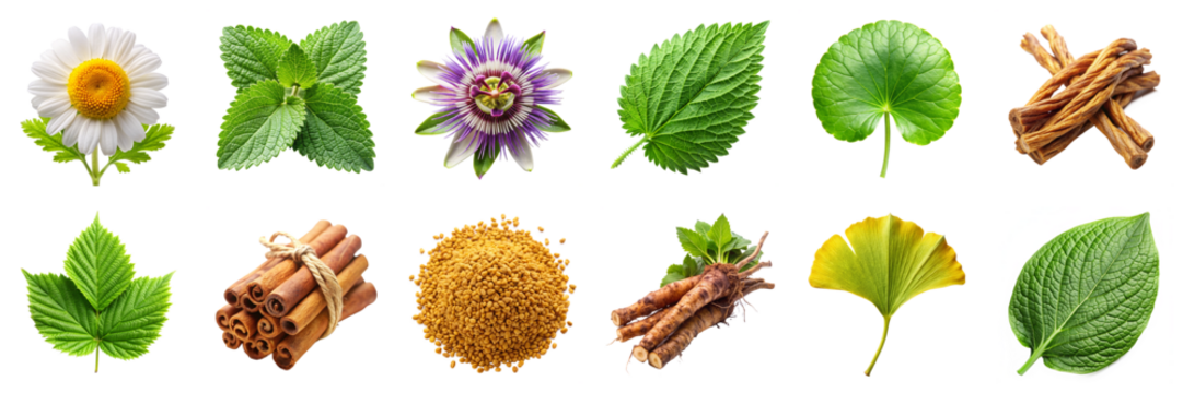 Medicinal herbs and roots isolated on transparent background. Includes chamomile, passionflower, ginkgo, fenugreek, and burdock in PNG collection
