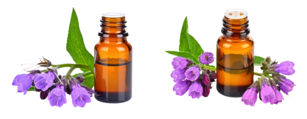 Amber Glass Bottles Of Oil Extract Surrounded By Purple Comfrey Blossoms and Green Leaves Against a Transparent Background