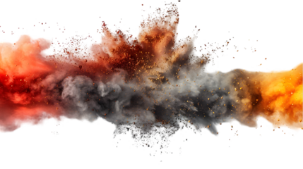 DarkRed, Grey, Golden colours powder exploding isolated on a transparent background