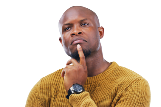 African man, doubt and thinking of ideas or confused by question, why and planning on isolated, transparent or png background. Remember, face and guy with a solution, problem solving or brainstorming