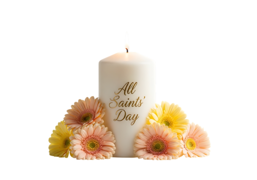 White candle with all saints day inscription surrounded by colorful gerbera daisies isolated on transparent background