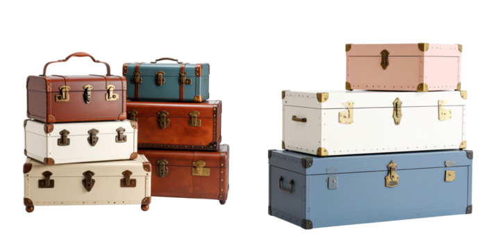 Vintage brown leather travel case with a lock and drawers, an old antique storage object isolated on white