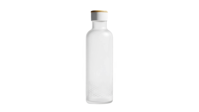 A clear glass bottle with a white cap on transparent background for commercial product display