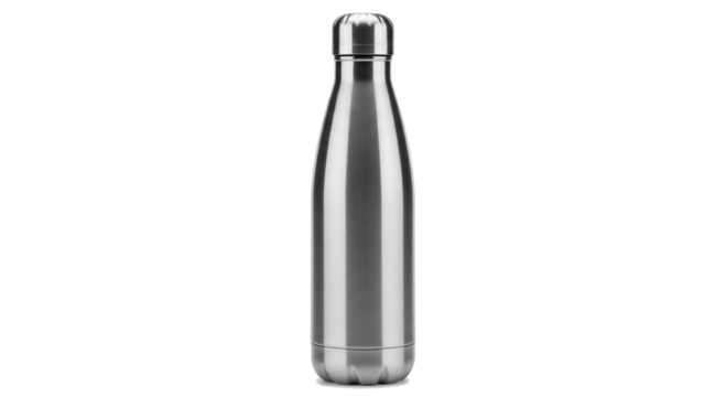 Metallic Water Bottle: A sleek and modern stainless steel water bottle, isolated, with its simple design reflecting a commitment to sustainability and hydration.