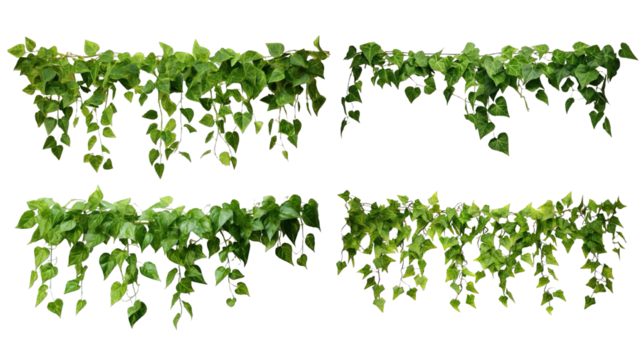 Three types of lush green ivy plants hanging on a white background, ideal for home decor, gardening projects, or natural designs.