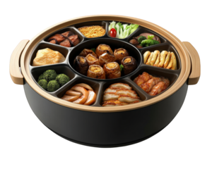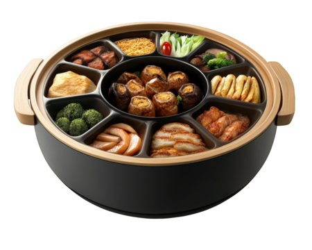 large multi compartment serving pot filled with various delicious foods, including sushi, vegetables, and meats, perfect for family gatherings and sharing meals